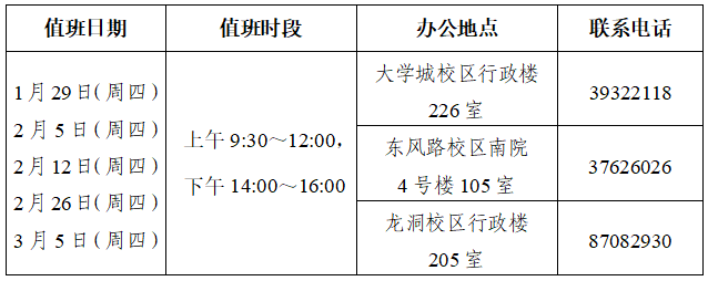 根据学校寒假安排的通知,保卫处寒假户政业务值班安排如下: